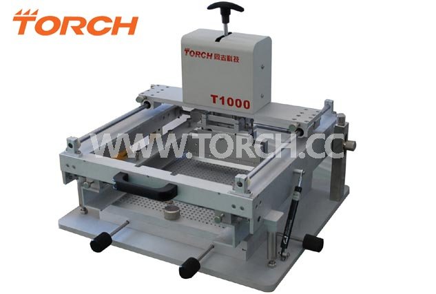 3、抬起印刷模板,取出PCB板,完成PCB板上焊盤的錫膏印刷過程。現有的全自動印刷機中帶動刮刀水平運動的傳動裝置主要通過兩個相互平行的導軌配合高精密滾軸絲杠傳動,利用絲杠旋轉實現刮刀在水平方向的移動,其方式既有效保證了刮刀水平運動、平穩運行的要求,而且印刷出的焊點均勻、可靠;手動印刷機一般采用橡膠刮刀,人工控制刮刀速度,角度和壓力。但是隨著電子行業的飛速發展,集成度越來越高的芯片不斷出現,對印刷機的印刷精度提出的很大的挑戰,特別是對于小型手動印刷機來說,行業中還停留在“沙模鑄鋁”和“純手動操作”階段,第一,平臺的問題滿足不了高精密的絲網印刷,第二,純手工的刮刀操作,使刮刀的角度,刮刀的壓力,刮刀的移動速度等都變得不可控,第三,精密印刷的一致性也不能保證,所以,T1000手動精密印刷機的出現,解決了上述在手動印刷領域不能解決的問題。T1000手動精密印刷機的出現,使電子廠僅僅用較低的成本就享受到了高昂的半自動或者全自動印刷機才有的功能,有效減低了生產成本,提高了印刷效率和印刷質量。