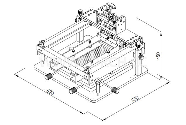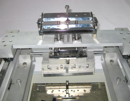 本機x、y、z和角度四軸都可以精密調整,通過調整四軸實現PCB板上的焊點和固定于模板框架上的模板相應開孔坐標的一一對應,并通過平臺的上升下降調整PCB和模板之間的距離。