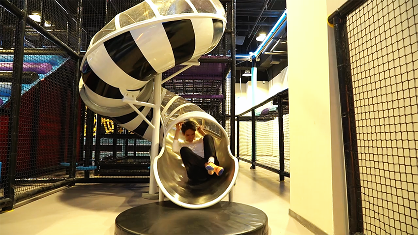 特制的衣服,通過蹦床的彈力,可以粘貼在覆蓋有魔術貼的墻壁上,從而實現(xiàn)“飛檐走壁”的體驗效果。