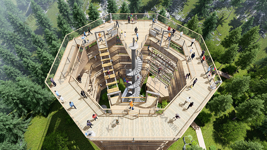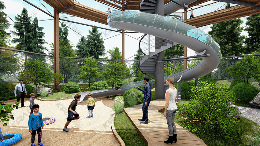 1、塔長23米,寬23米,高25米,由八根立柱圍合成正八邊形; 2、售票處位于塔體外側,并設有鋼構樓梯,上行8米到達一層平臺; 3、一層平臺往上可通過螺旋木棧道到達塔頂,棧道分五層,每層高三米; 4、一層平臺處設有旋轉滑梯,可劃至塔底,滑梯直徑0.95米,總長33米; 5、底層設有臨時商店,可為游客提供簡易餐飲; 6、出入口進行分流設計,避免擁堵,給游客營造一個良好的游玩環境,也方便景區管理。